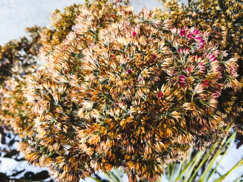 När snön tinar bort tittar den här kärleksörten fram i min trädgård. Trots att den är vissen, ett tjockt snölager och bitande kyla, finns det fortfarande röda små blommor kvar!